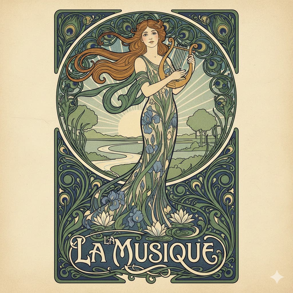 Art Nouveau, Alphonse Mucha style, graceful plant-vine-like curves and decorative beauty