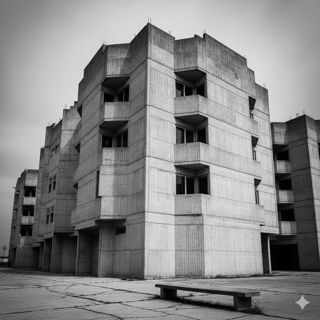 Brutalism, massive exposed concrete, grand and imposing architectural style