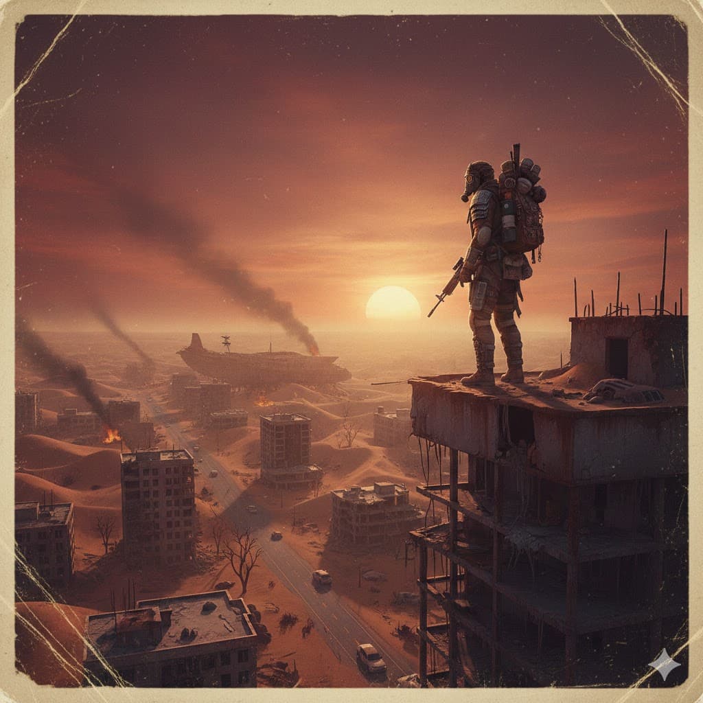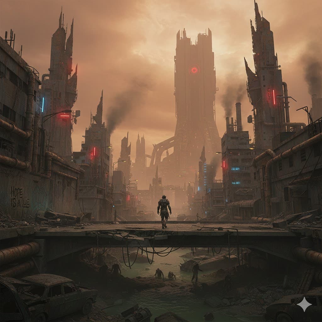 Post-apocalyptic, ruins overgrown with vines after the end of the world
