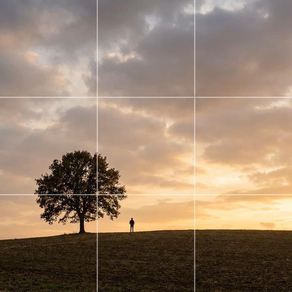 Rule of thirds composition, divide the frame into thirds horizontally and vertically and place the subject at the intersections; the most stable and fail-proof composition