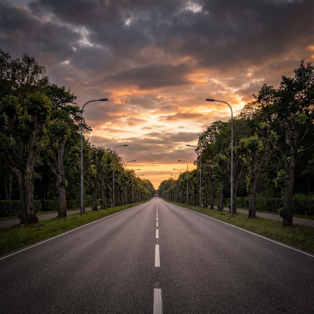 Vanishing point, a composition where all lines converge to a single point, like the end of a road, maximizing perspective