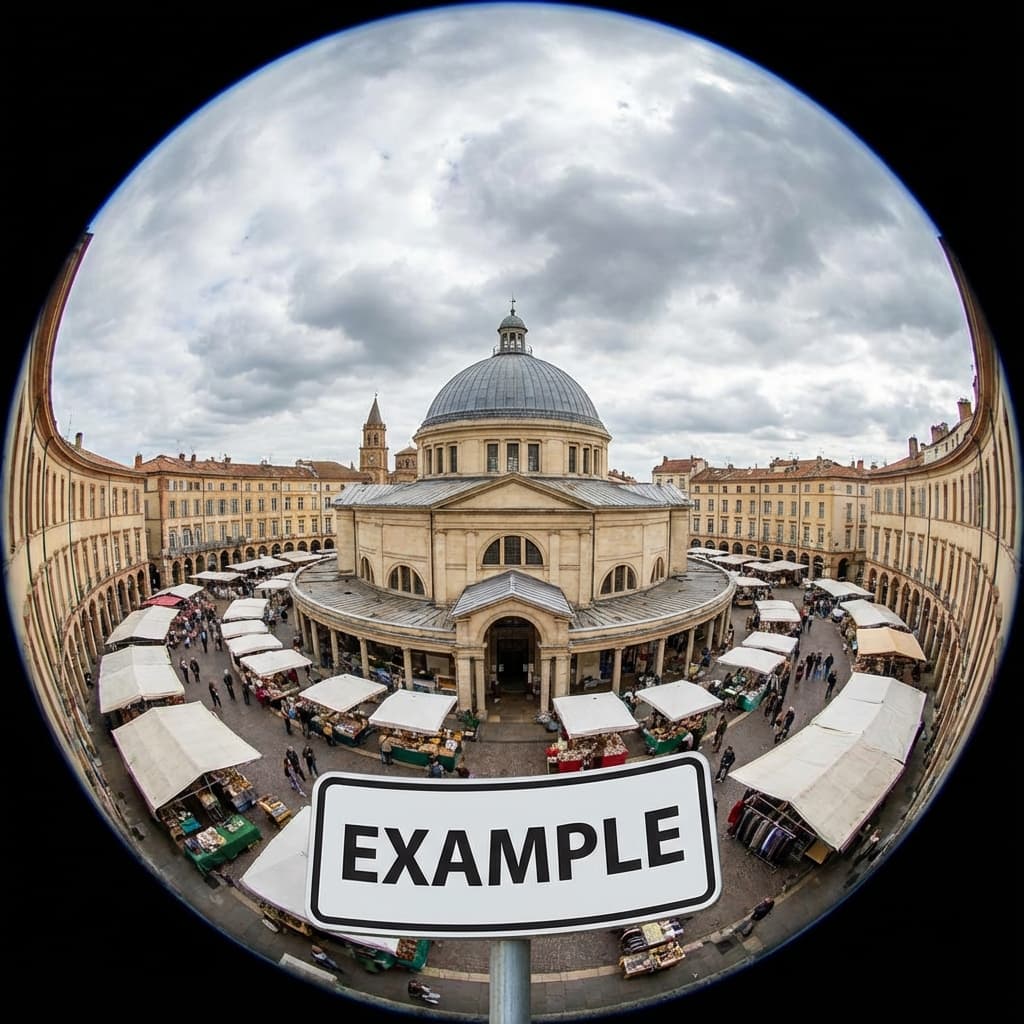 Fish-eye lens, the center bulges outward and the background curves roundly, used in 90s hip-hop music videos or to depict narrow spaces