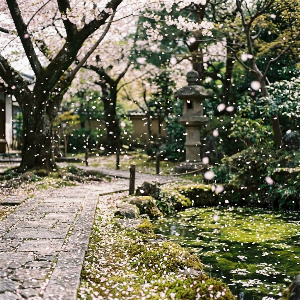 Falling petals, romantic staging of cherry blossom or rose petals blowing in the wind