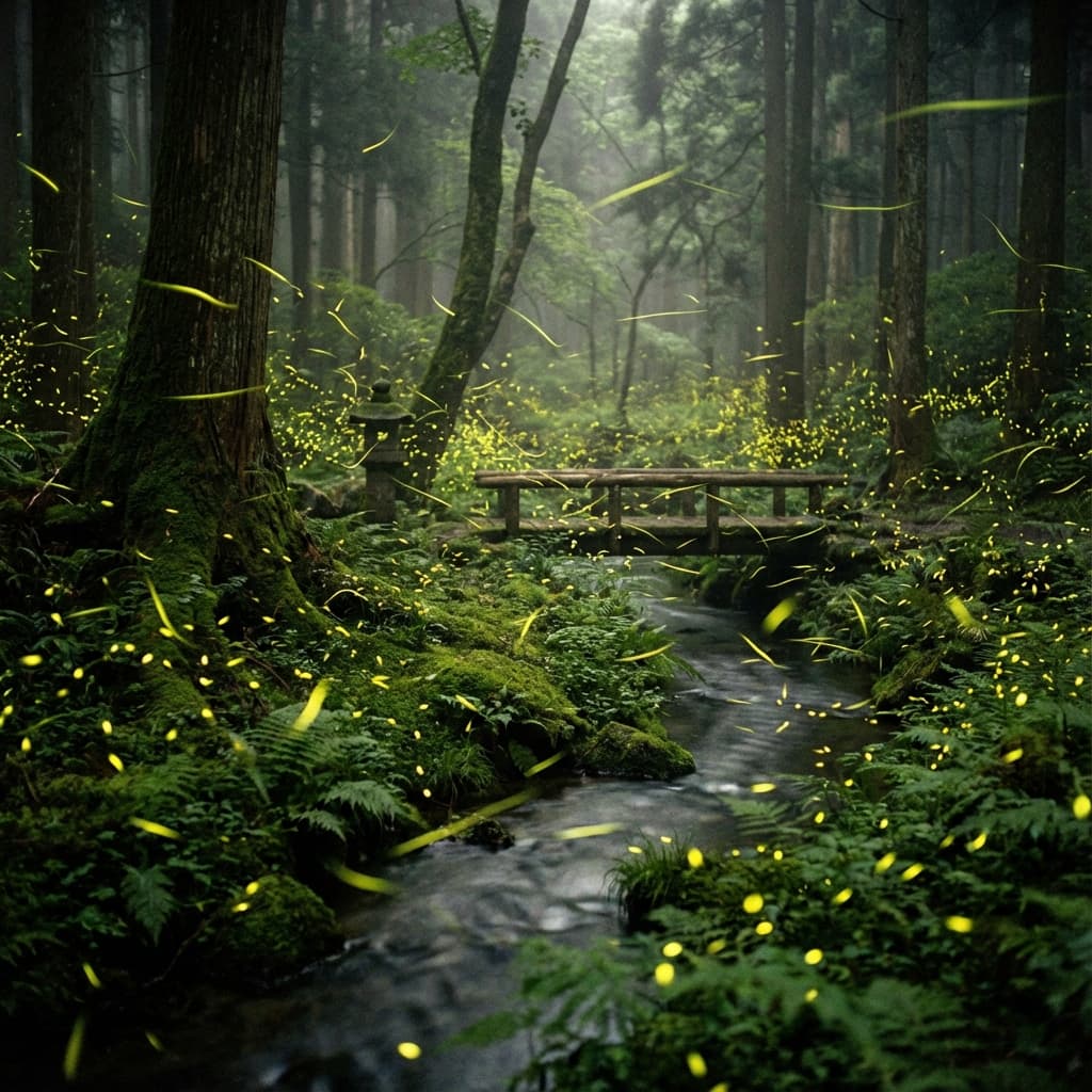 Fireflies, yellow/green glowing dots that gently light up night forests or dark places