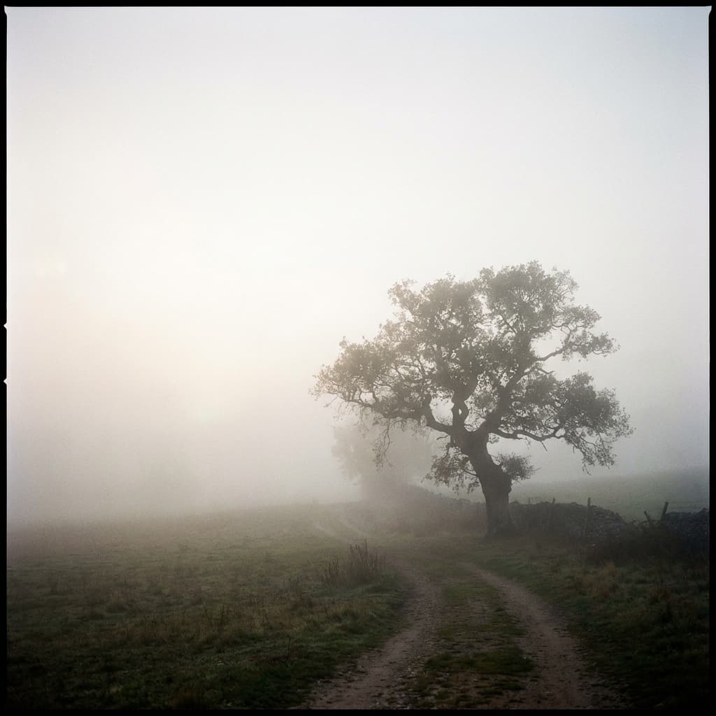 Fog, low-lying or overall hazy atmosphere, emphasizing mystery and distance