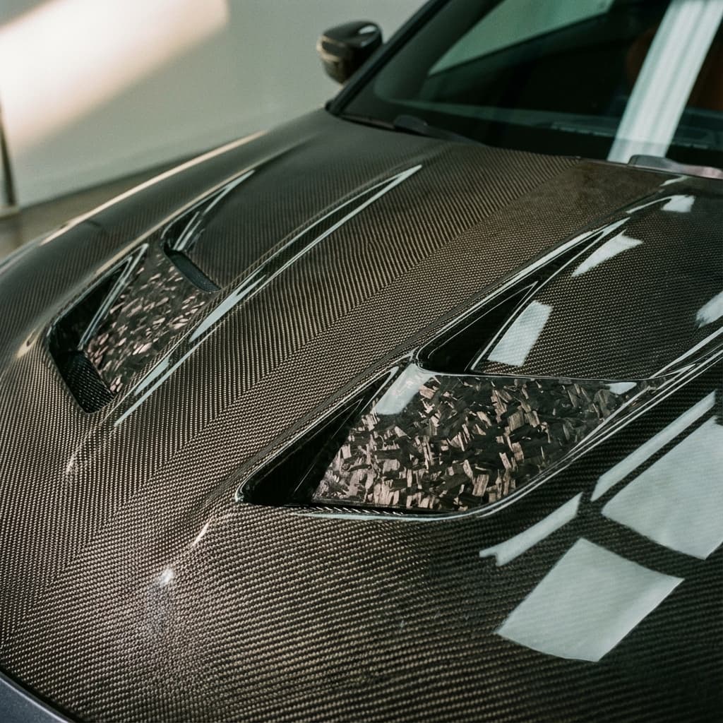 Carbon fiber, a black advanced material with a herringbone-like pattern used in sports cars and high-tech devices
