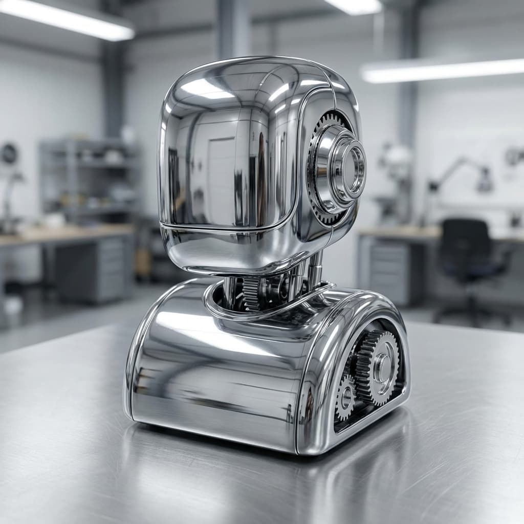 Chrome / polished metal, a shiny silver surface that reflects its surroundings like a mirror