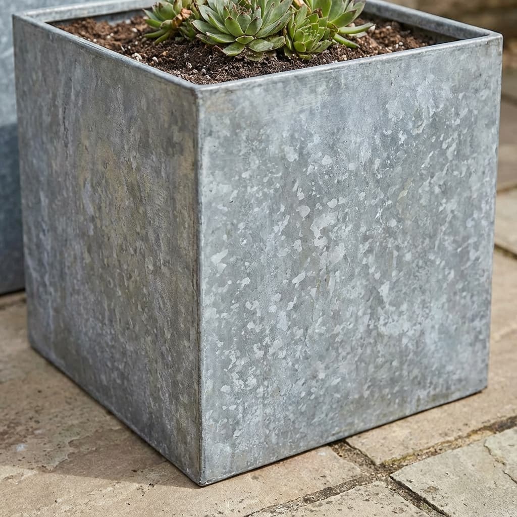 Galvanized, the distinctive mottled metal pattern seen on construction pipes or steel plates