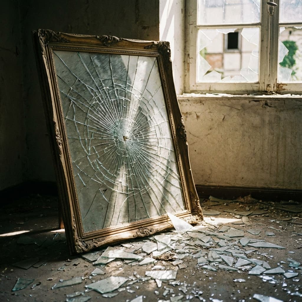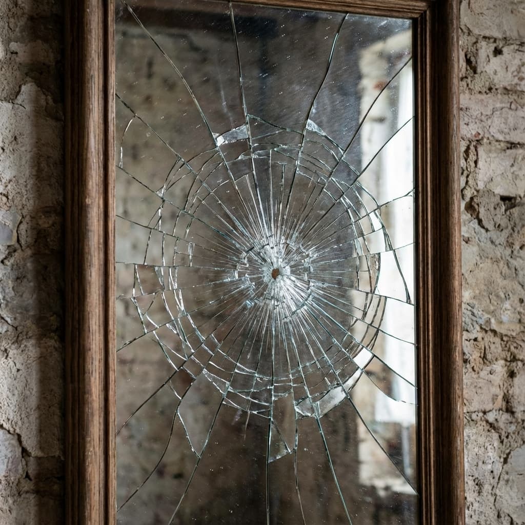 Shattered / broken, a state where glass has broken into pieces or fragments are flying