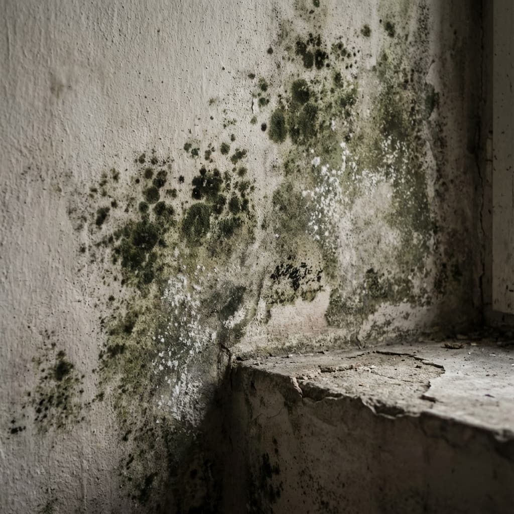 Mold / mildew, bluish or black spots growing on damp wallpaper or food