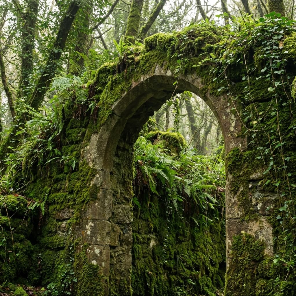 Mossy / overgrown, a state where moss and vines have grown in gaps of stone or buildings